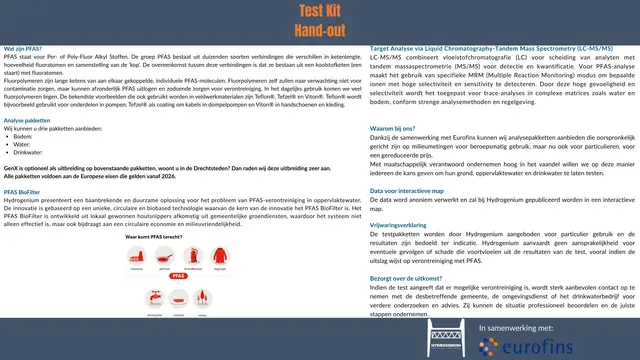 De testkit bevat onderanderen: monsterafname instructies, PFAS-vrije handschoenen, emballage, retoursticker en informatie over PFAS in uw leefomgeving.